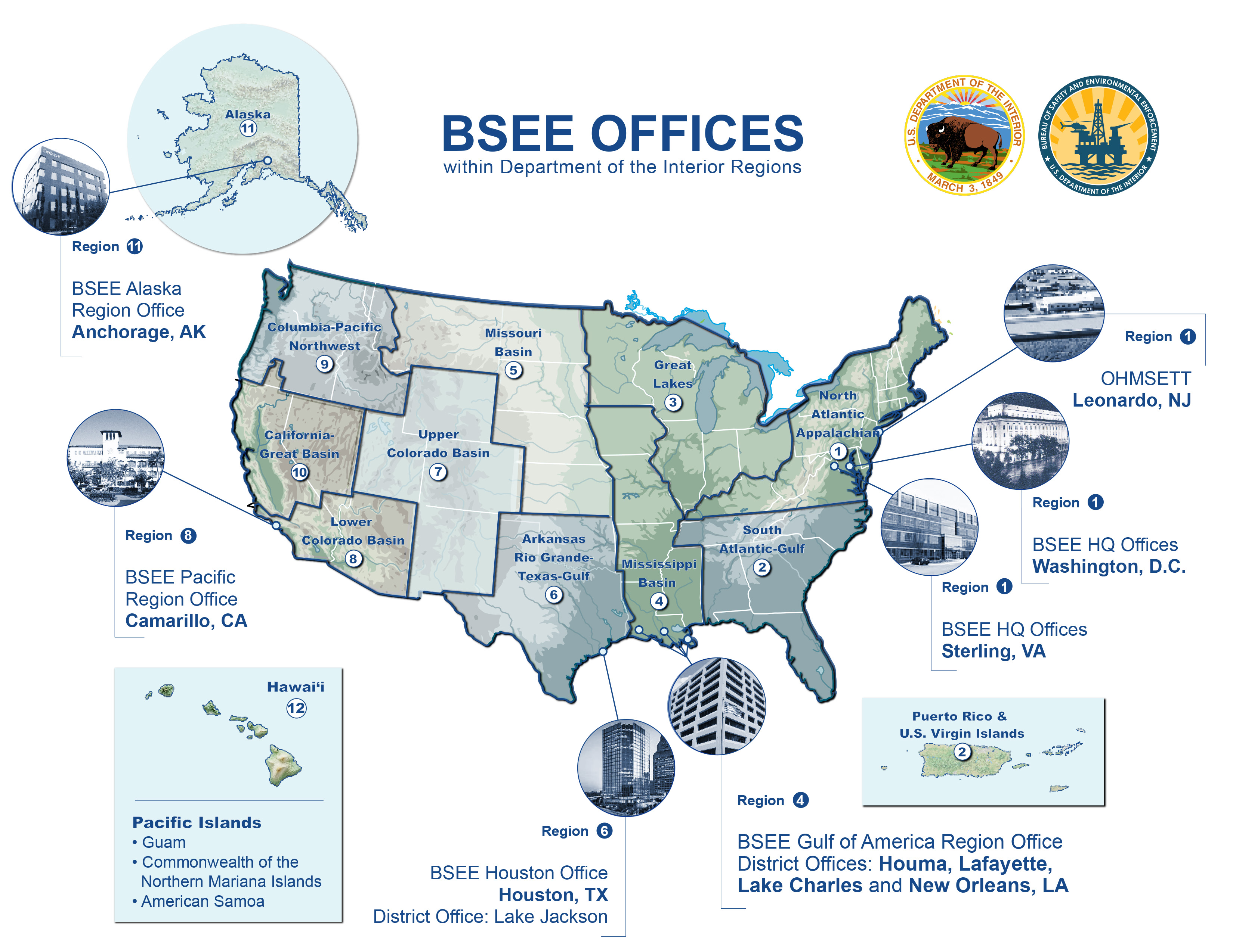 The Bureau of Safety and Environmental Enforcement is headed by an appointed director who oversees a staff of more than 850 federal employees. With headquarters located in Washington D.C., and Sterling, Virginia, national policy is set by BSEE’s six divisions and implementation of policies is achieved through three regional offices: one in New Orleans, one in Anchorage, one in Camarillo, California. The bureau also operates an office in Houston Texas, near major offices for the majority of the offshore energy industry.