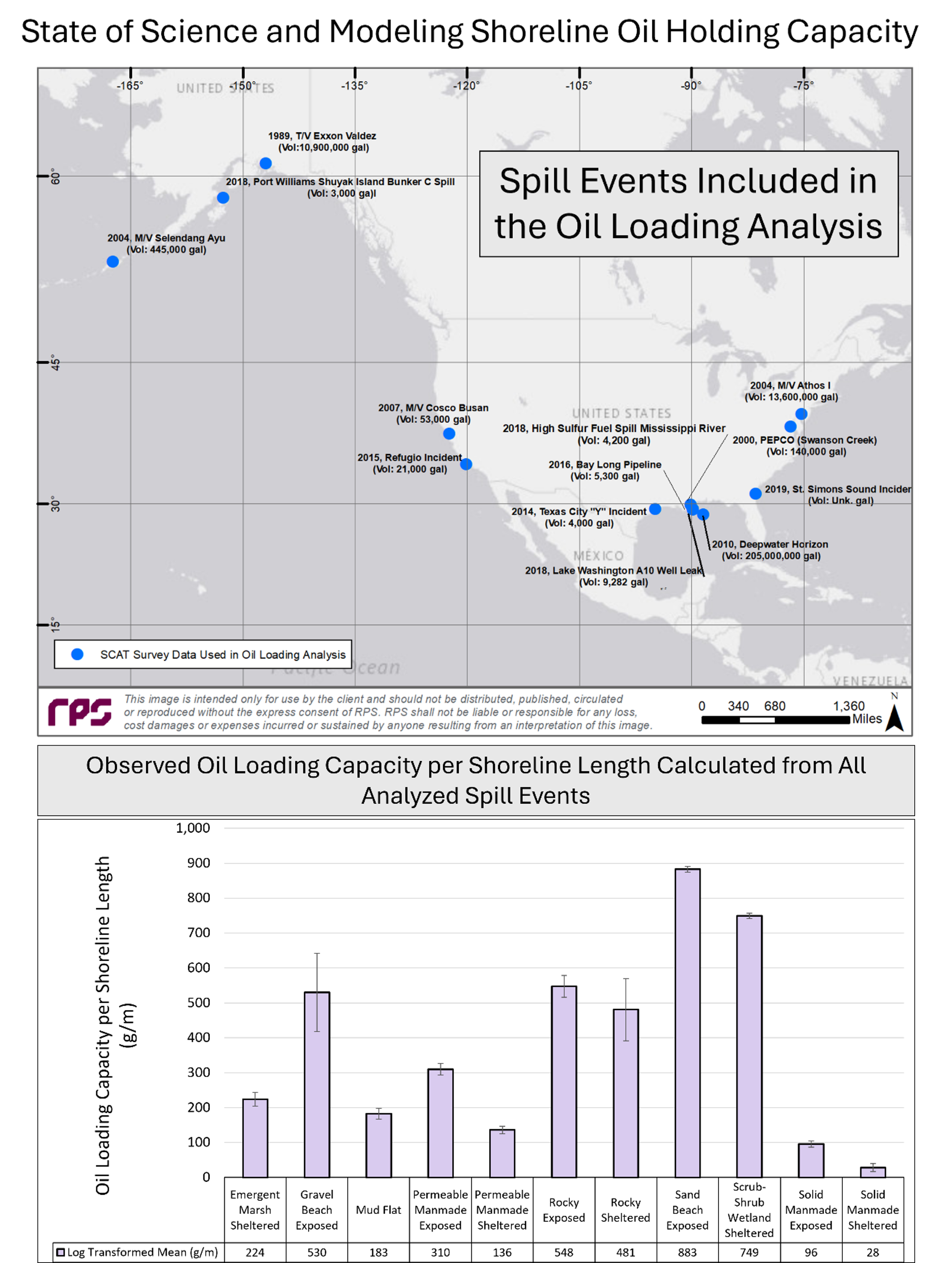 This assessment analyzed data from 13 different historic spill events covering a range of shoreline types and spill conditions. Using field data to develop shoreline oil holding capacities inherently captures the complexities of oil retention on specific shoreline types (e.g., sediment composition) and environmental conditions (e.g., tidal fluctuations, wave energy). The oils included in this analysis were crude oils, emulsified oils, and intermediate-heavy fuel oils. Therefore, the results from this study can be applied to spills with those oil types as well as light crudes that have weathered or emulsified prior to reaching the shoreline (e.g., Deepwater Horizon). This study provides modelers with an updated oil loading capacity data set that can be applied in operation oil spill models depending on the spill-specific conditions and shoreline types.